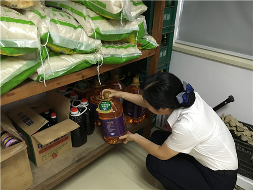 工作人員重點對食堂的內(nèi)外環(huán)境、庫房、操作間衛(wèi)生情況、餐飲廚具的清洗消毒情況、從業(yè)人員的采購登記、一日三餐留樣制度等進行了細致檢查。并對檢查過程中存在的問題當場要求食堂人員立即進行整改。
