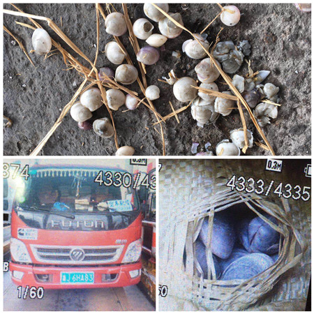 11月2日上午10:39分左右,車牌為浙J6HA83的小貨車駛?cè)霚貛X西收費(fèi)所2號(hào)崗?fù)ぃ撥囻{駛員稱自己運(yùn)載的貨物為綠農(nóng)產(chǎn)品,要求免費(fèi),堵塞車道一個(gè)多小時(shí)。最后在取證報(bào)警下,駕駛員交付通行費(fèi)320元。 該車被篷布包著,車上貨物又被袋子緊緊包著。當(dāng)工作人員要求檢查取證時(shí),駕駛員只摳開指定的袋子,并且口子開得非常小,只讓人隱約看到貨物是貝殼。工作人員按規(guī)定要求駕駛員打開另一處取證,駕駛員以貨物被繩子綁著不好打開為由,只在前端把袋子摳了一個(gè)比硬幣大點(diǎn)的小洞,拿出幾個(gè)貝殼,工作人員看到其拿出的貝殼不管是在大小還是顏色上,都和他剛才指定的那袋貨物有明顯區(qū)別,于是工作人員親自用手摸進(jìn)去查驗(yàn),經(jīng)仔細(xì)檢查,貨物屬于貝殼中的殘次品,懷疑是飼料用途。