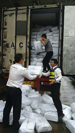 圖為工作人員幫忙搬運(yùn)掉落的貨物 這輛滿載海鮮的綠農(nóng)車,貨物掉滿車道,司機(jī)一人束手無策,當(dāng)班班長(zhǎng)陳豐平在拍完綠農(nóng)照片后,叫上班員林葉輝,一起快速幫助司機(jī)一件一件地傳遞貨物。盡管每一袋貨物都十分重,但是他們?yōu)榱藥椭鷰煾堤嵩缯碡浳铮櫜坏媚樕辖豢椀暮顾陀晁?/span> 由于工作人員的幫助,司機(jī)離開時(shí)一直道謝。他們對(duì)司乘人員的主動(dòng)援助,使得溫嶺西收費(fèi)所的服務(wù)不單單停留在窗口問候上,還將延伸服務(wù)一直呈現(xiàn)。 陳豐平