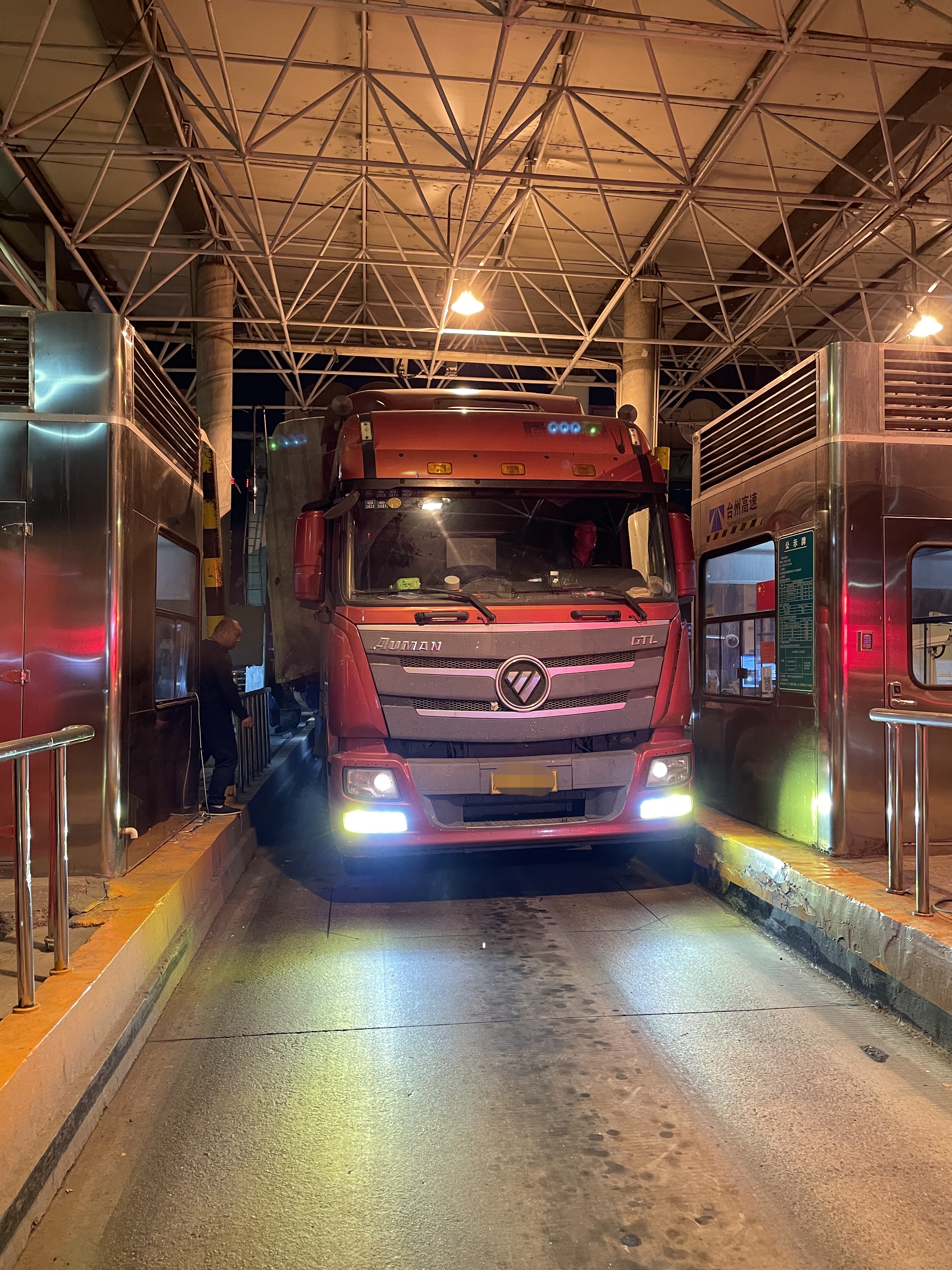 夜幕下的溫嶺西收費站入口,繁忙而有序,大貨車一輛接著一輛,對于超限車輛也在有序勸返當中。這時,一輛運輸廢木板的車輛蓋著篷布飛快地駛入9號車道,不過該車已進入勸返人員的密切關注之中,坐崗人員林華平也已做好了對該車勸返的準備。
