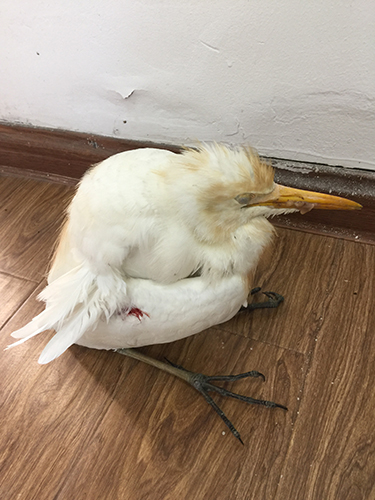 圖為受傷的牛背鷺 走近細看,這只鳥耷拉著腦袋,有著圓滾滾的小身子,尖尖的嘴巴和細長的腿,不同于平常所見的鳥類,其左側翅膀還有紅紅的血印子,估計是被人射獵受傷。 后經百度查詢,臺州市林業專業人員鑒定確認,此鳥為省級保護鳥類牛背鷺。專業人員欣慰地說,幸好隧道所人員及時救助,否則這只鳥鷹會有生命危險。它的翅膀受傷嚴重,這是奮力飛行一段時間后因受傷而掉落,已經沒有了捕殺能力。