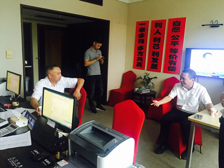 圖為集團副董事長、總經理張建平在天臺收購點詳細詢問收購工作具體開展情況 張建平向各地方政府前期對公司股權收購工作的支持表示感謝,他介紹了當地臺州高速股權收購進展情況,同時闡明收購工作中存在的困難,需要地方政府繼續(xù)對我們的工作給予支持和幫助。三地政府都表示一定會全力支持這項工作。仙居縣分管公司股權收購的常務副縣長說,“放心吧,我們一起想辦法,先從持股較多的法人股入手,再化大力氣做小股東工作,一定會圓滿完成任務。” 張建平一行先后來到三地股權收購點,向收購一線的工作人員表示親切的問候。張建平對大家的工作給予肯定,感謝所有人勤勤懇懇,無私付出,并希望大家繼續(xù)努力,共同實現目標。工作人員詳細介紹了日常具體工作方法,他們緊跟公司股權收購總體布局,并結合當地特殊情況,因地制宜,有序靈活地開展股權收購工作。