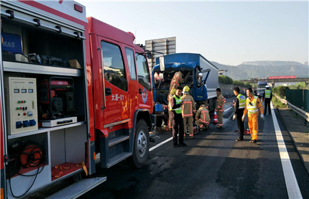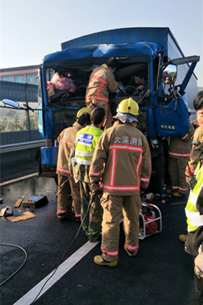 4月19日上午6點10分,寧向大溪出口正在進行分流,所有車輛正緩慢前行中,一輛贛F38***牌照的藍色大貨車顯然還沒有適應(yīng)這分流的節(jié)奏,“砰”地一聲猛然撞上了前面的大貨車。 兩個“大家伙”碰撞的威力非同小可,直接的后果就是后車的車頭變形,損傷極大,貨車駕駛員被卡在車頭里出不來。 時間就是生命,施救中心迅速出動,配合交警、消防部門在現(xiàn)場進行預(yù)警,并協(xié)助進行事故處理。