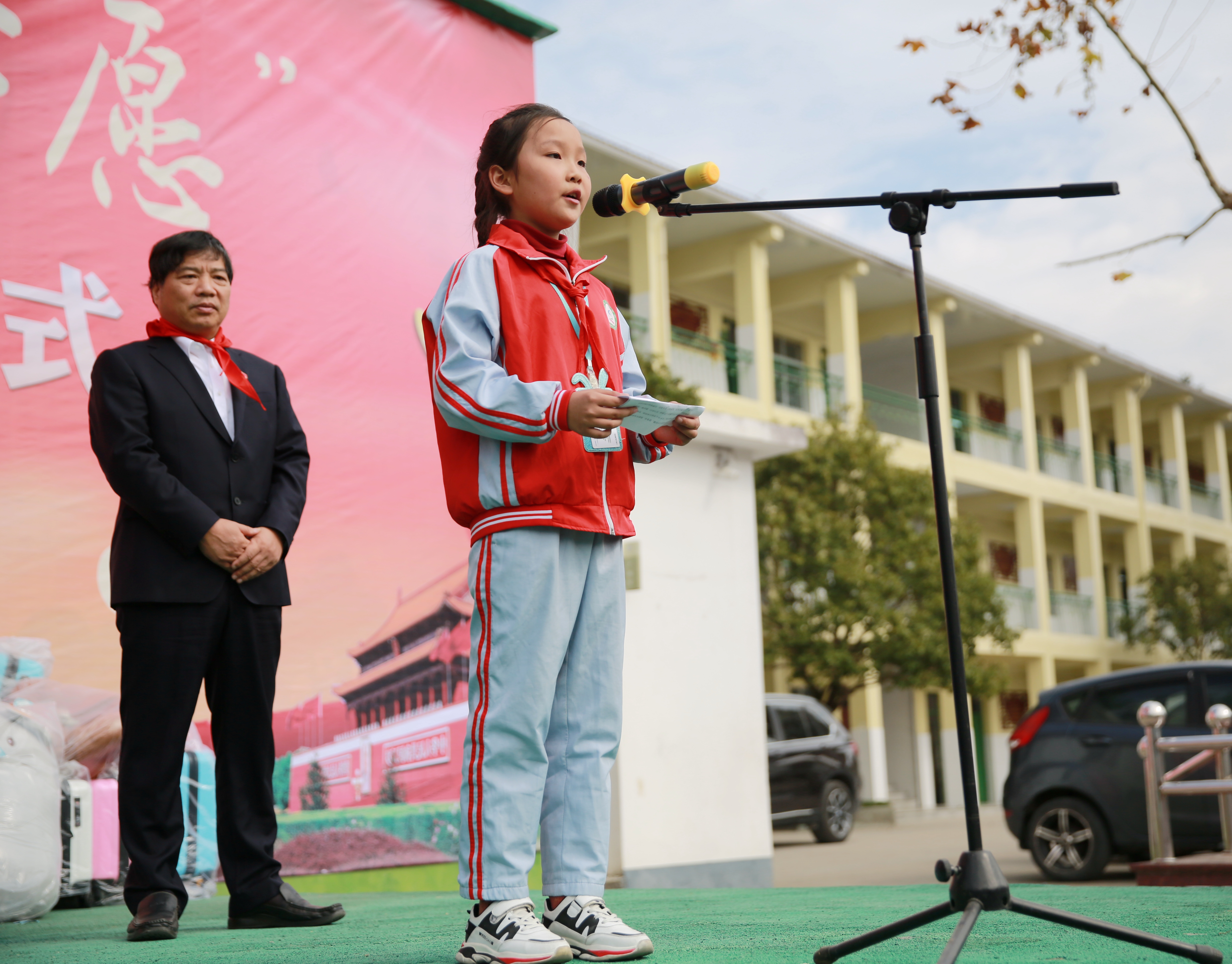 在“點亮微心愿”環節,臺州高速集團領導班子們為學生代表送上新衣服、學習用品等,孩子們則為志愿者叔叔阿姨們系上了在他們眼中最珍貴的紅領巾。
