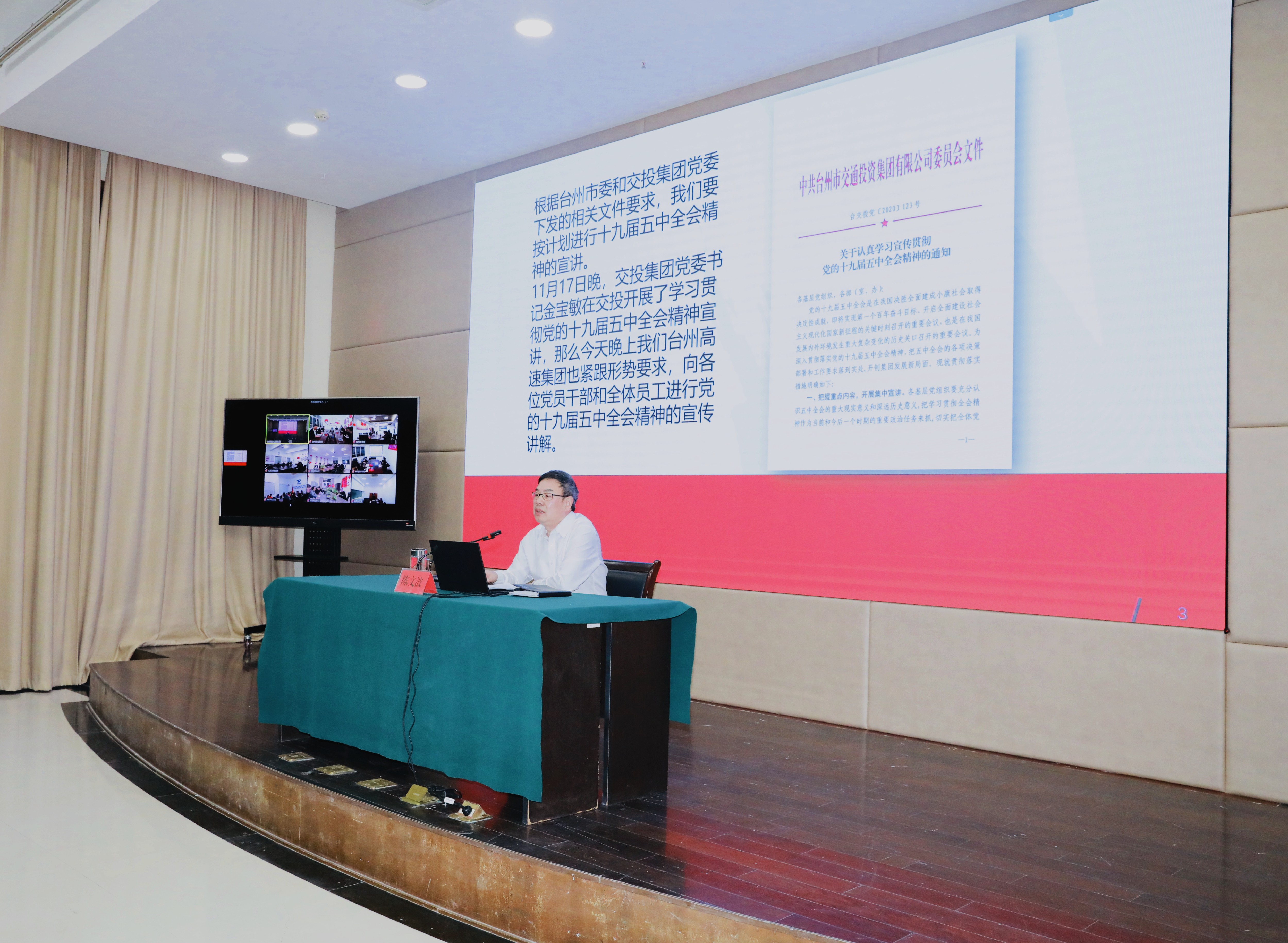11月23日晚,臺州高速集團黨委書記、董事長、總經理陳文波在集團大樓會議室作黨的十九屆五中全會精神宣講報告。集團領導班子成員,各支部書記,大樓全體員工現場參加學習,各所、中心、子公司通過視頻會議系統同步學習。