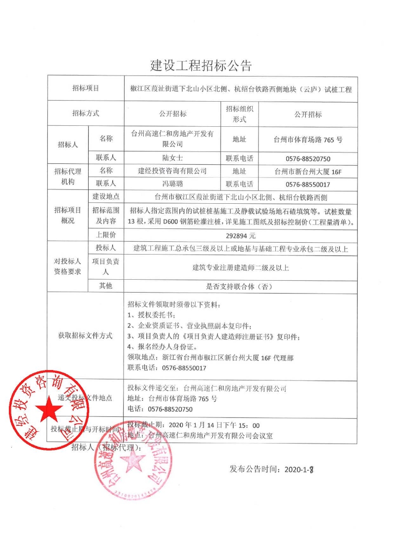 椒江區葭沚街道下北山小區北側、杭紹臺鐵路西側地塊(云廬)試樁工程招標公告