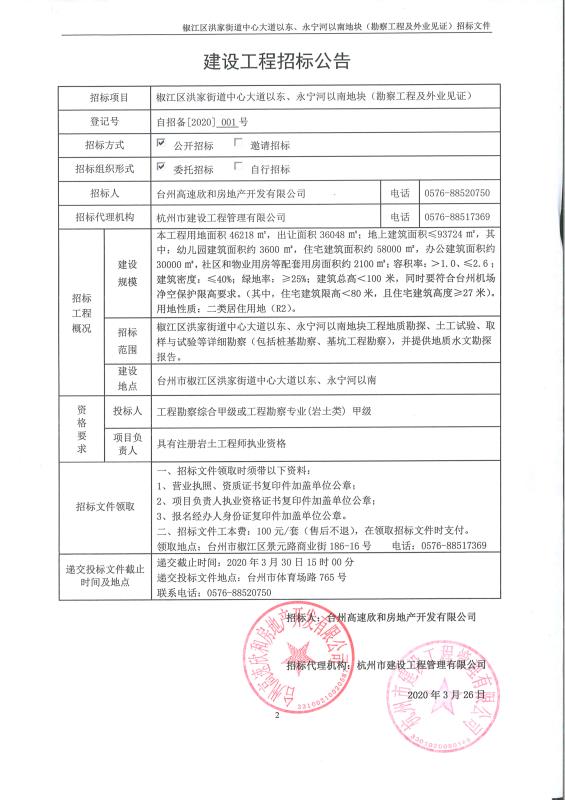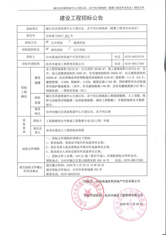 椒江區洪家街道中心大道以東、永寧河以南地塊(勘察工程及外業見證)工程招標公告