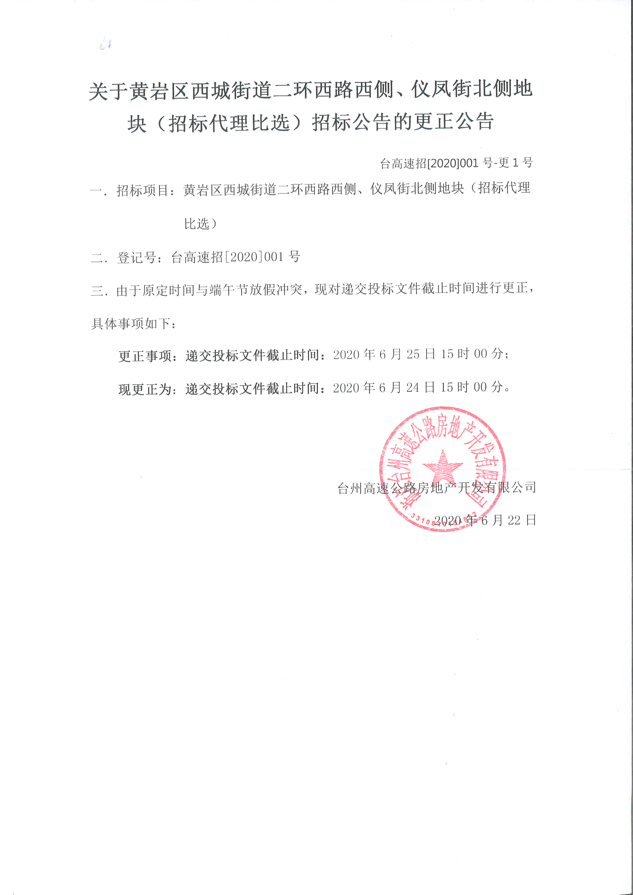 關于黃巖區西城街道二環西路西側、儀鳳街北側地塊(招標代理比選)招標公告的更正公告
