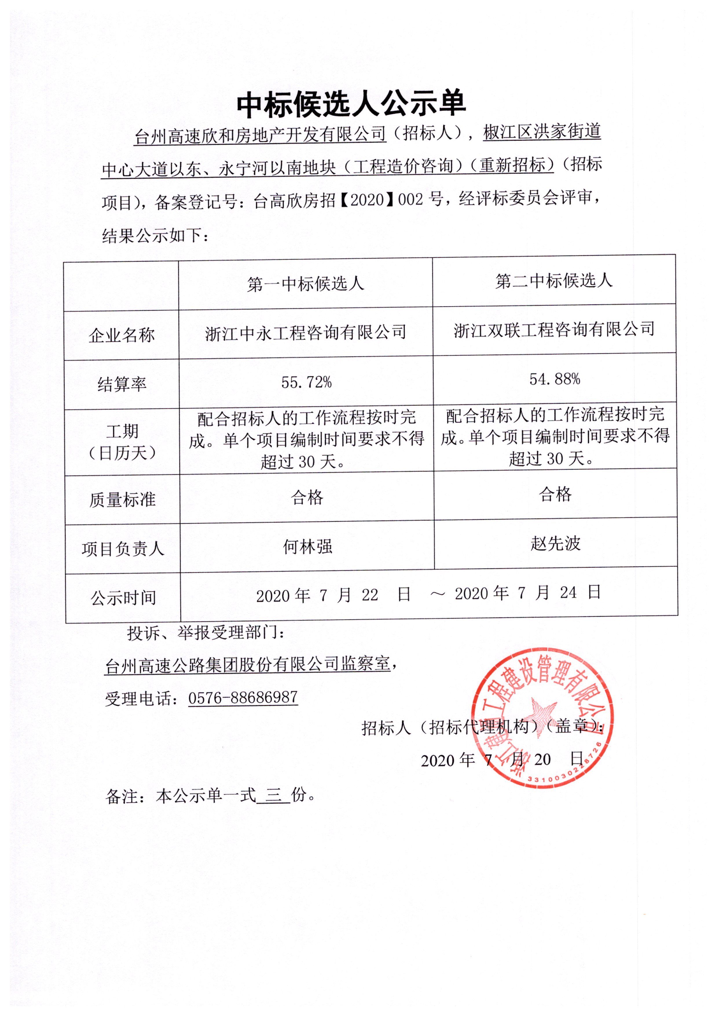 椒江區洪家街道中心大道以東、永寧河以南地塊(工程造價咨詢)中標候選人公示單