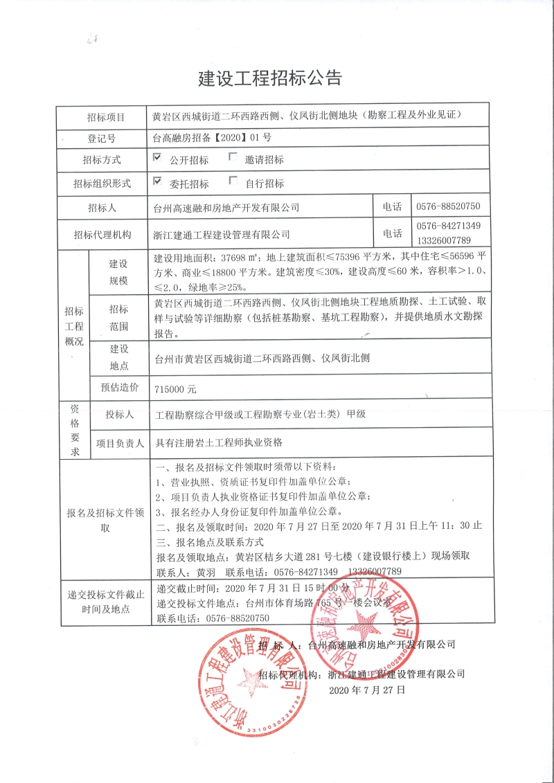 黃巖區西城街道二環西路西側、儀鳳街北側地塊(勘察工程及外業見證)建設工程招標公告