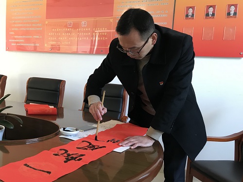 上聯(lián)“自強(qiáng)不息吉慶到”、下聯(lián)“厚德載物福運來”,橫批“喜迎新春”,個個遒勁有力的大字從筆尖輕快地躍出,行云流水的書法讓在場人員無不拍手叫好。所長孫明偉亮出絕活,揮毫潑墨,豪邁大氣地?fù)]寫著一幅幅春聯(lián)。