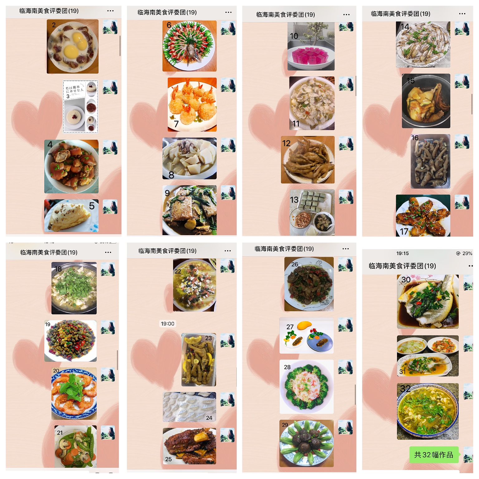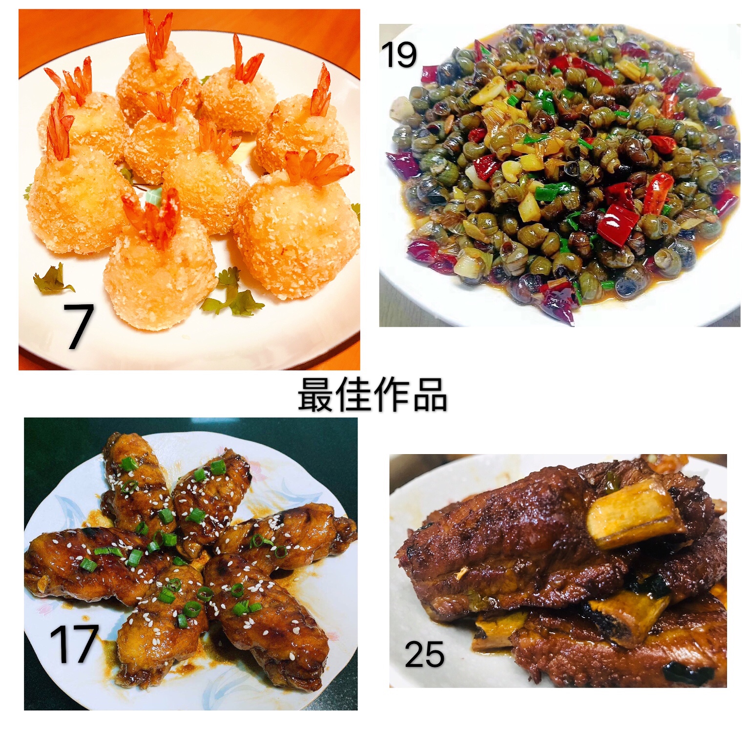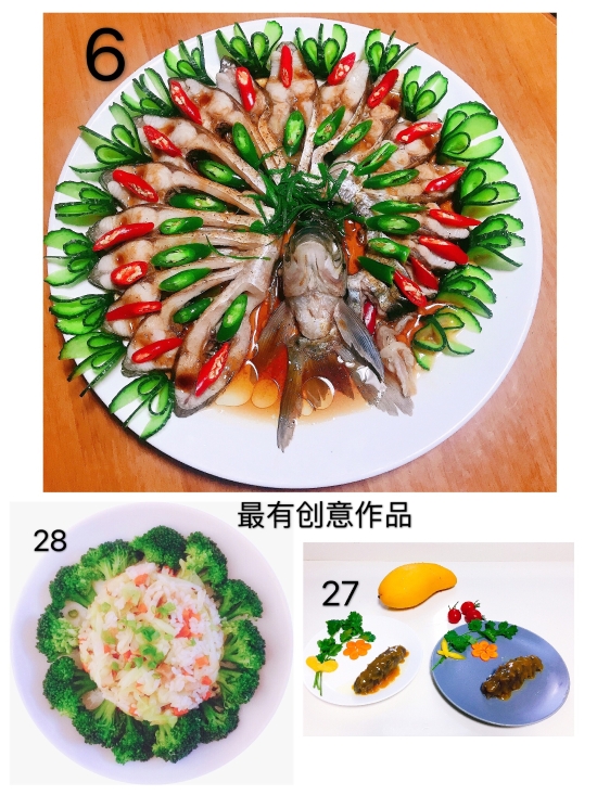 本次活動(dòng)共32幅作品進(jìn)行參評(píng),最終評(píng)選出朱英英的《鳳尾蝦球》、謝海云的《饞嘴螺絲》、李菊麗的《昂翔展翅》、陳瑩的《骨色骨香》為“最佳作品”,朱英英的《孔雀開(kāi)屏》、葉懿慧的《向陽(yáng)花》、吳琴琴的《秋收》為“最有創(chuàng)意作品”。大家紛紛相約疫情過(guò)后,以廚會(huì)友、以食為樂(lè),來(lái)一場(chǎng)百家宴一飽口福。