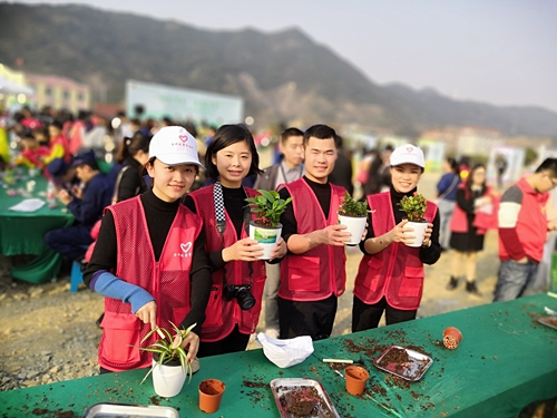 圖為志愿者結(jié)束活動(dòng)獲得盆栽